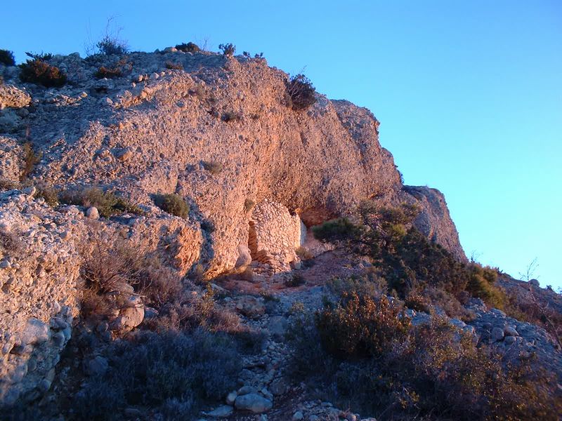 allí veurem a mà esquerra a pocs metres l'ermita de Sant Joanet, penjada dalt dels cingles sota una bauma