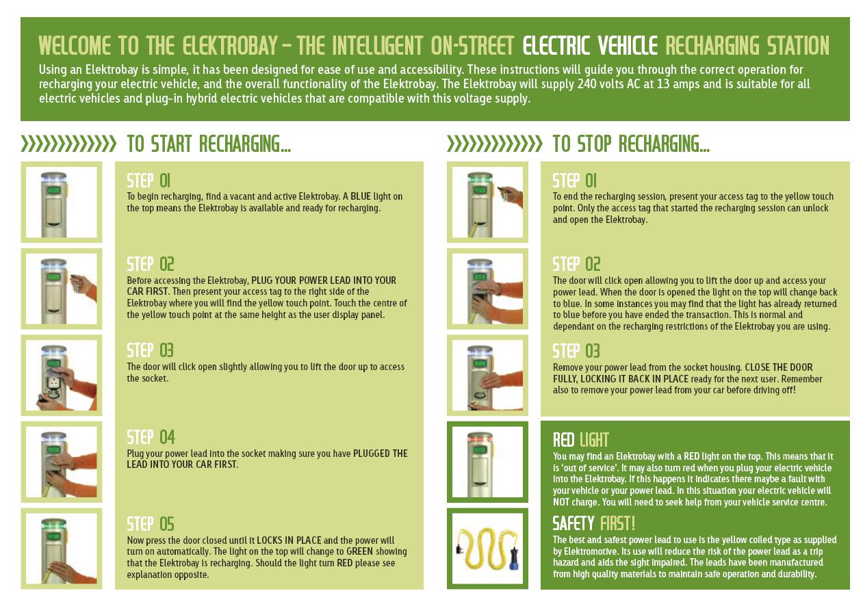 Key is swiped adjacent to door, door then releases, user slides open door, plug inserted, door slides closed then locks by way of solenoid bolt. Power delivered to vehicle.