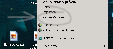 Bajad el adjunto de este mensaje, descomprimidlo com winrar, y instaladlo. Después seleccionad las fotografias a reducir, boton derecho, y aparecerá una nueva entrada que dirá: resize pictures, clicad y especificad el nuevo tamaño, se crearan archivos nuevos de tamaño reducido.