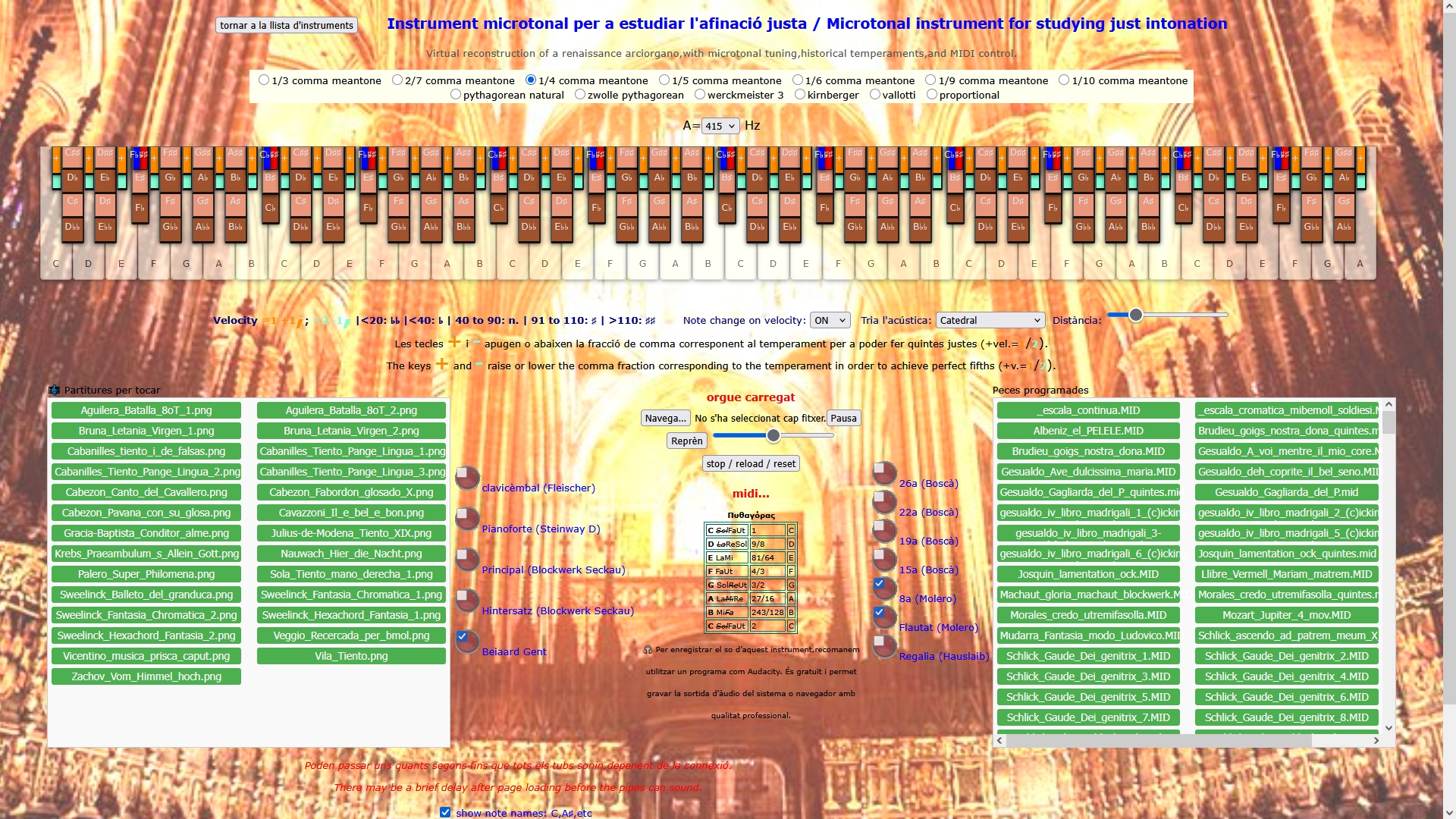 A més, hi ha dos valors de velocity més: velocity 2 i 1, que corresponen a les tecles de color verd clar i taronja del teclat. Aquestes actuen sobre la mateixa tecla sobre la qual estan col·locades, rebaixant l'afinació en el primer cas i apujant-la en el segon, segons la fracció de comma corresponent a la quinta en el temperament seleccionat. En el cas típic del mesotònic de quart de comma, això representa un quart de comma amunt o avall, de manera que es poden obtenir quintes pures sense sacrificar les terceres que hi pugui haver. Si vols aconseguir l'afinació justa per algun arxiu MIDI que tinguis, el millor és que primer usis aquesta eina: http://www.casacota.net/midi/detector_de_quintes.htm per a marcar automàticament les quintes susceptibles de correcció, i que després el facis sonar amb el seqüenciador inclòs en aquest instrument (botó "navega"). Llavors també s'obrirà l'opció de reproduir només els canals que vulguis, cosa útil si vols fer maquetes per a estudiar les veus de la peça. |