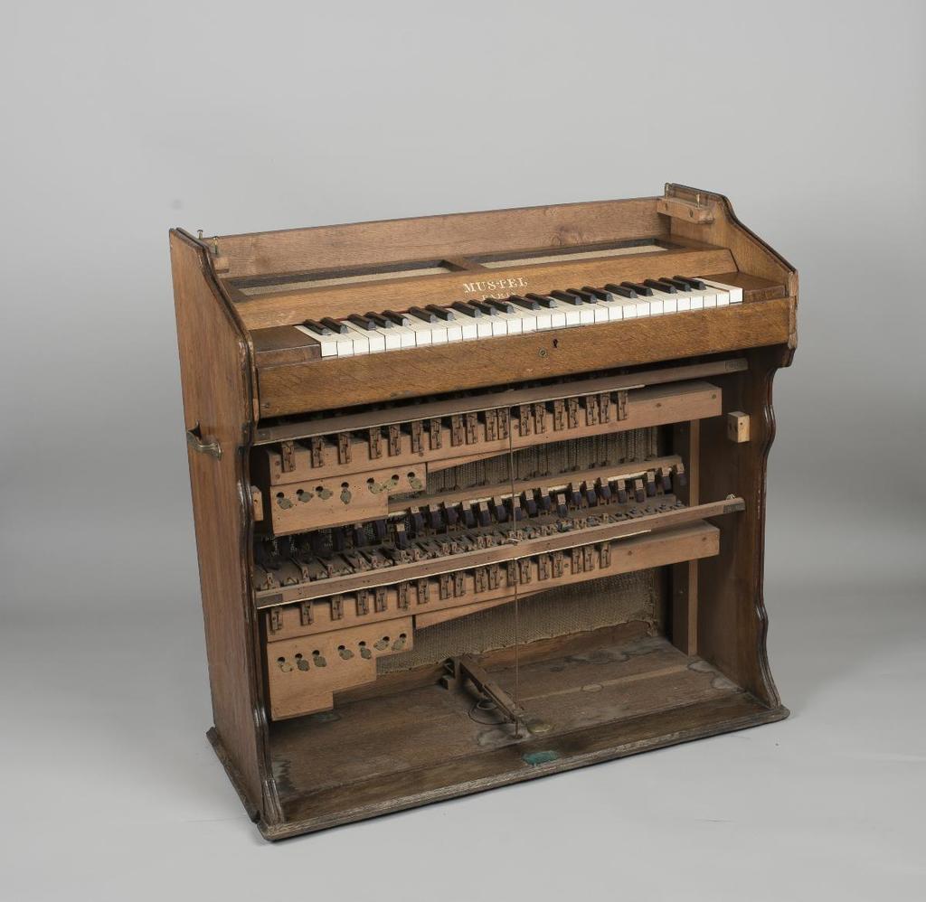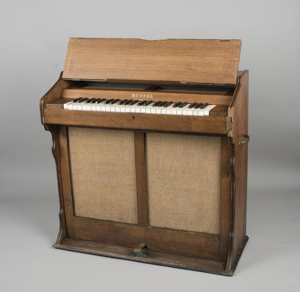 L'any 1886, la fàbrica Mustel de París va desenvolupar un nou instrument: la célesta. és un instrument de teclat, però els martellets accionats per les tecles no percudeixen cordes, sinó unes làmines metàl·liques situades sobre uns ressonadors de fusta. La sentim en música simfònica i, especialment, en música de cinema. La celesta del Museu de la Música va arribar gràcies a una donació de l'Orquestra Simfònica de Barcelona i Nacional de Catalunya (OBC), que també té la seu a l'Auditori. Té un pedal per activar els apagadors i el teclat està format per quaranta-nou tecles, amb una extensió de quatre octaves. |