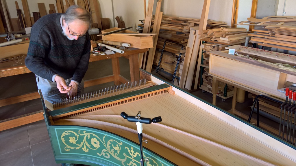 However, there is one obvious issue: a harpsichord string does not sound the same if it is the only one tensioned and tuned as if all the others are also. The other strings resonate in sympathy, and the tension on the body of the instrument also affects its sound. For this reason, preliminary work was done on a reconstruction of a Zell harpsichord, which came from the same workshop as the Fleischer, first recording all the notes one by one, with the rest of the strings unstrained, and later, with the entire instrument tuned with all the strings, to obtain a pattern of change, a pattern that was computer-modeled and later applied to the samples obtained from the Fleischer in the museum. Photo of this preliminary work, years before tackling the definitive recording: |
