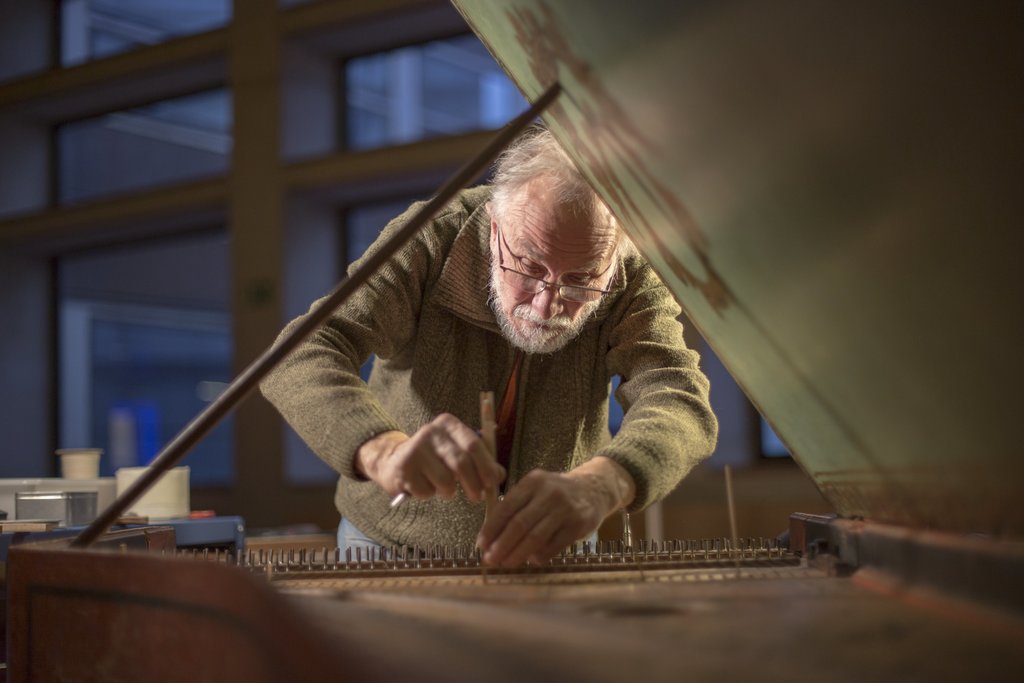 Hi ha però una qüestió evident: una corda d'un clavicèmbal no sona pas igual si és l'única tensada i afinada que si tota la resta també ho estan. Les altres cordes ressonen per simpatia, i la tensió sobre el cos de l'instrument també n'afecta el so. Per aquest motiu es va fer un treball previ sobre una reconstrucció d'un clavicèmbal Zell, sorgit del mateix taller que el Fleischer, enregistrant primer totes les notes d'una en una, amb la resta de les cordes destensades, i posteriorment, amb tot l'instrument afinat amb totes les cordes, per a obtenir un patró del canvi, patró que es va modelitzar informàticament i es va aplicar posteriorment a les mostres obtingudes del Fleischer del museu. Foto d'aquest treball previ, anys abans d'abordar l'enregistrament definitiu: |